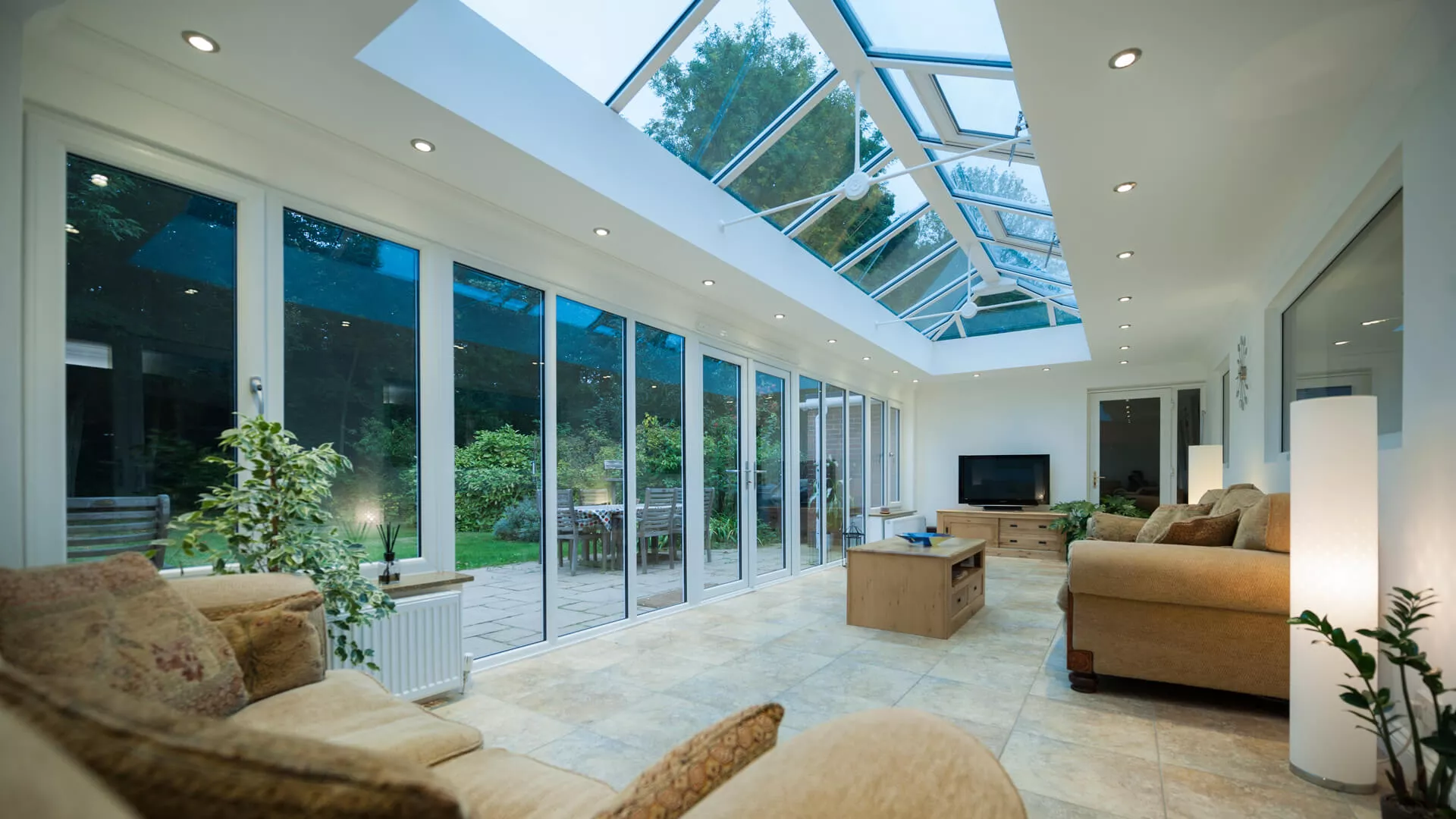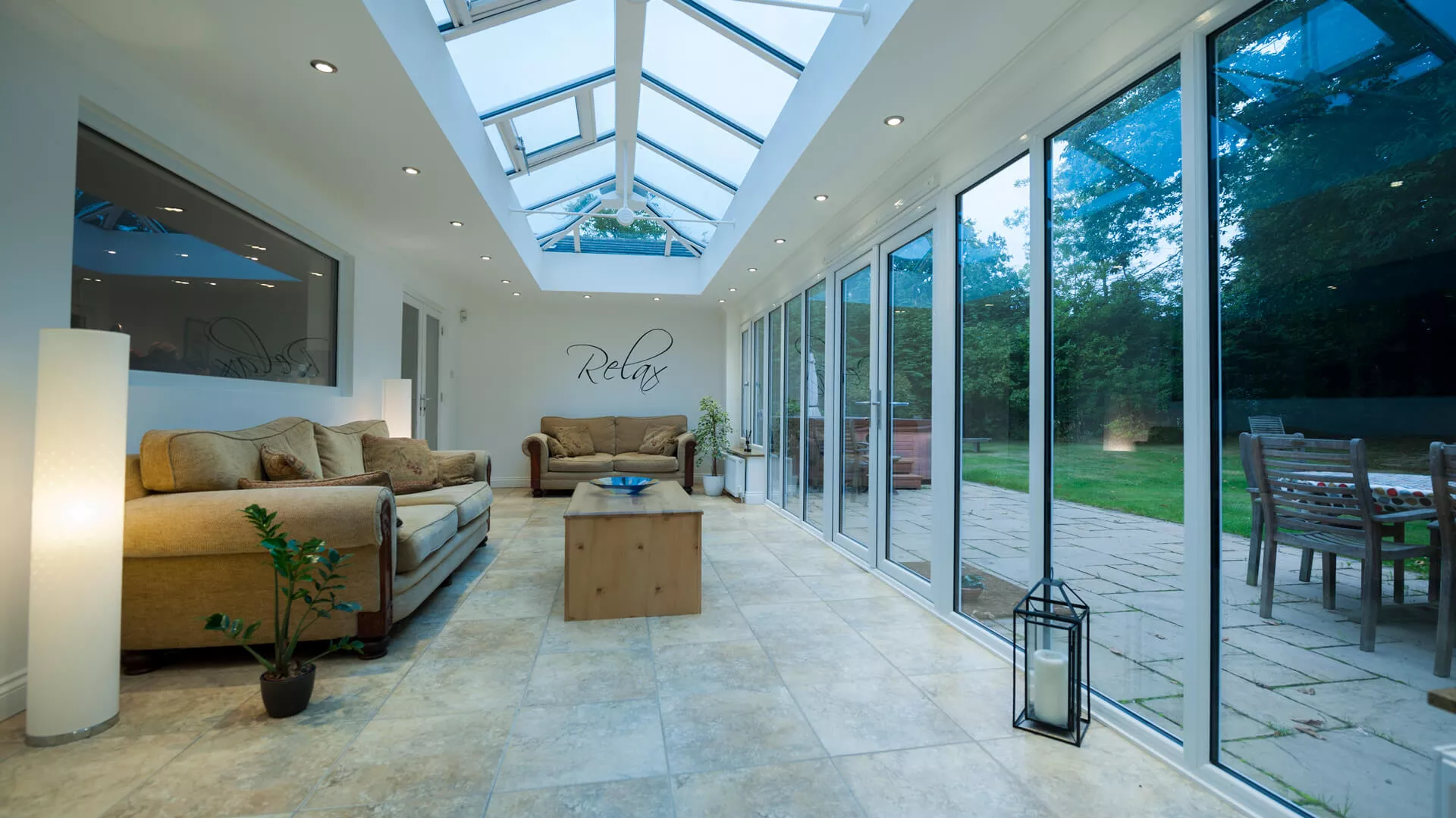 It doesn’t matter what time of the day the occupants want to work, relax or eat in their conservatory. Inside of the internal pelmet are spotlights and they emit enough light to allow such activities to go on, day or night. It was partly due to this internal pelmet and the depth of it that the full height glass panels were put in so that not a bit of daylight was compromised in the daytime. It was no sweat installing this conservatory for our fitters, and the owners don’t get a sweat on using the space.