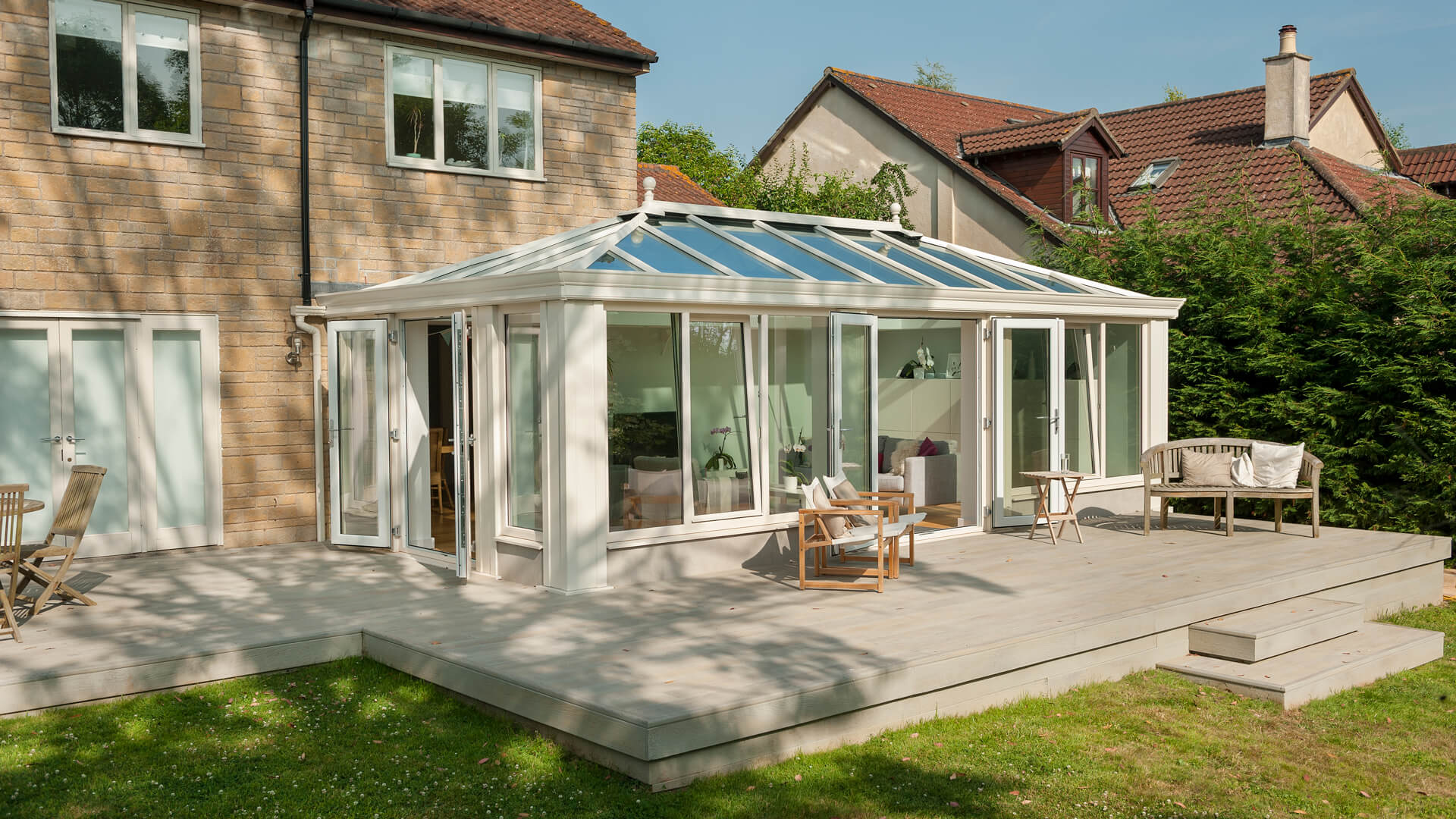 It’s only a few years ago since the Loggia was first unveiled to the world, but it has caused such a stir and become one of the products that customers most aspire to own. Imagined by Italian designers, and constructed by Britain’s best engineers, it offers the light and spaciousness that you’d expect of a traditional glass conservatory, and comes with the thermal benefits of a brick-built extension. This particular Loggia comes in a classic cream finish and has super insulated corner columns that make it a real work of art. Look above, and what you see is a solar controlled glass roof.